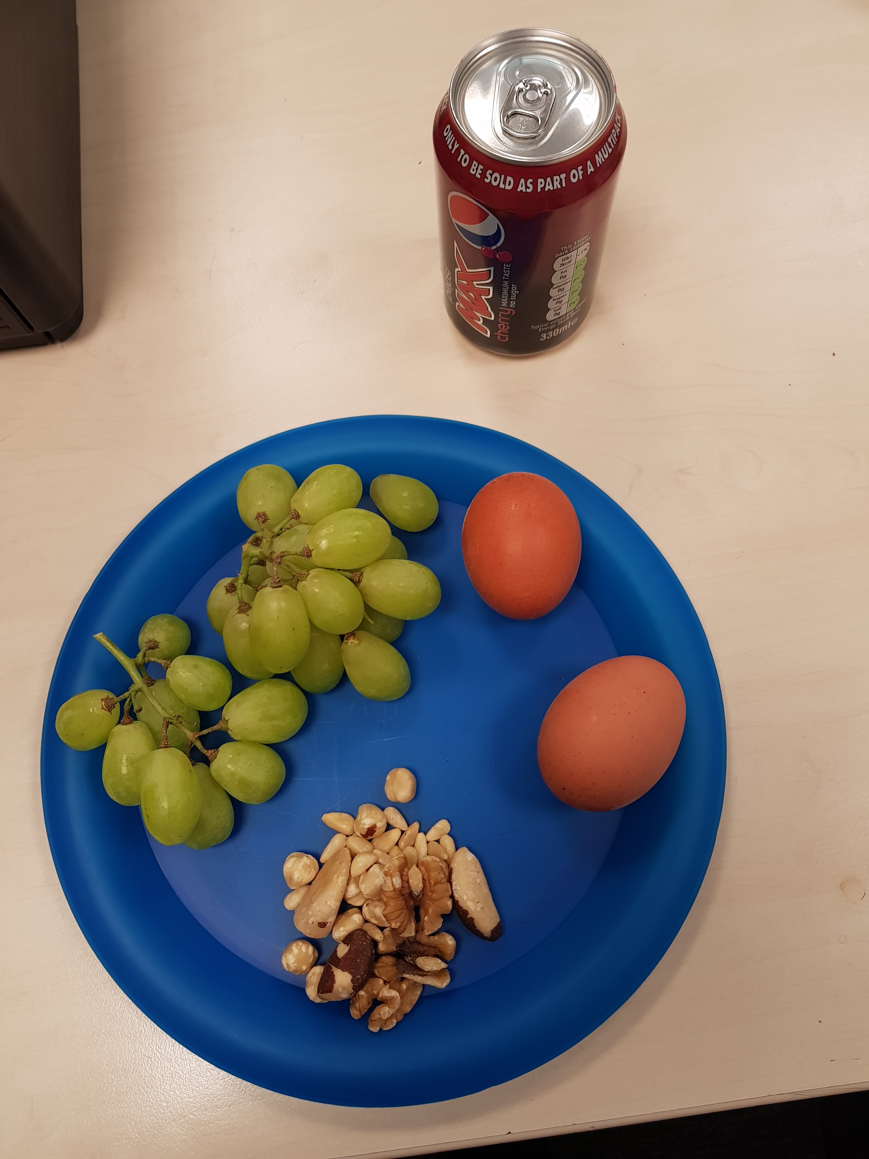 Have made a good start for today, below is my breakfast and snack. I read we should be including more natural nuts into our diets, a small handful a day. They’re good sources of fibre and loads of nutrients, but also calorific, hence the sorry looking small handful. I’ve swapped regular fizzy for very enjoyable max cherry drink, which is in my opinion much, much nicer than any other diet drink, and as for the eggs, unsalted! And I got a nice treat, one of them was a double yolker! And a good protein source.