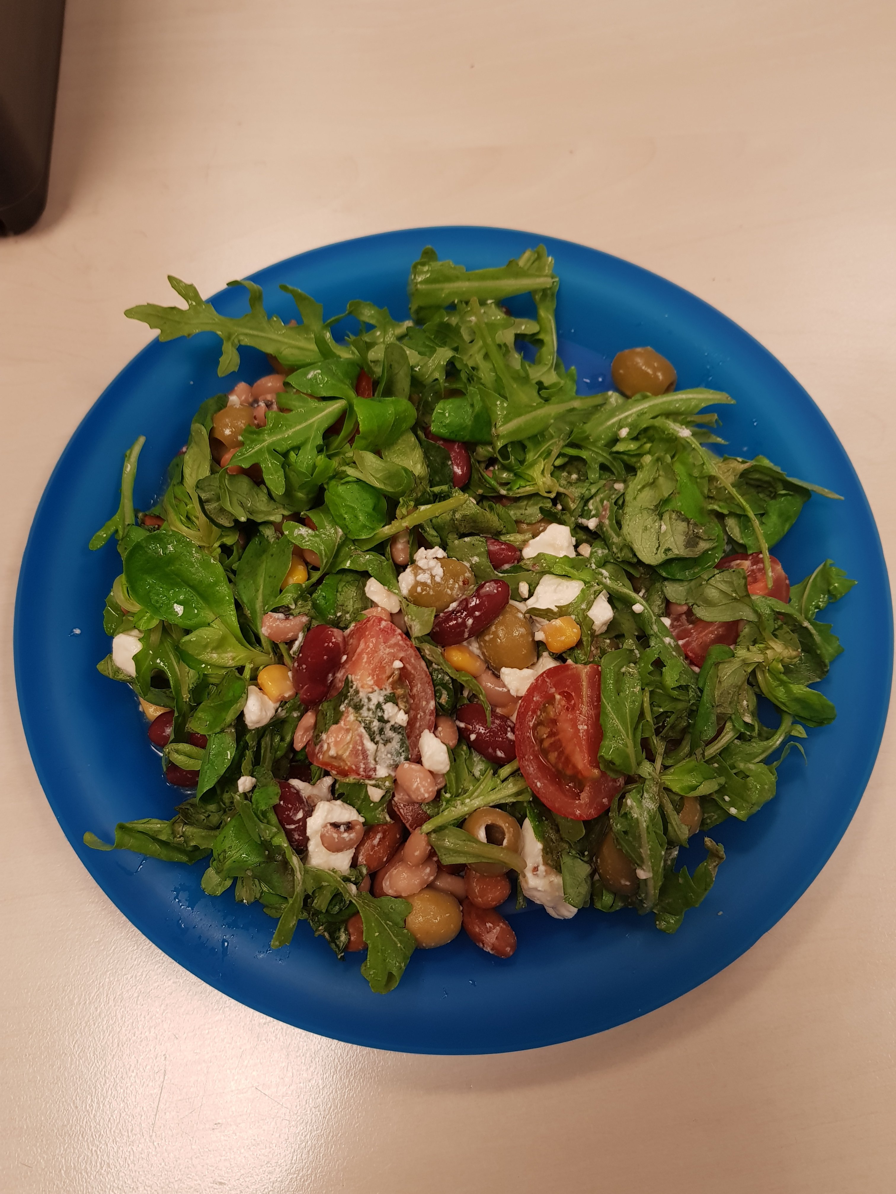 Rocket, lambs leaf, tomatoes, canned mixed beans, olives and a healthy option honey and mustard dressing! I love food 😋