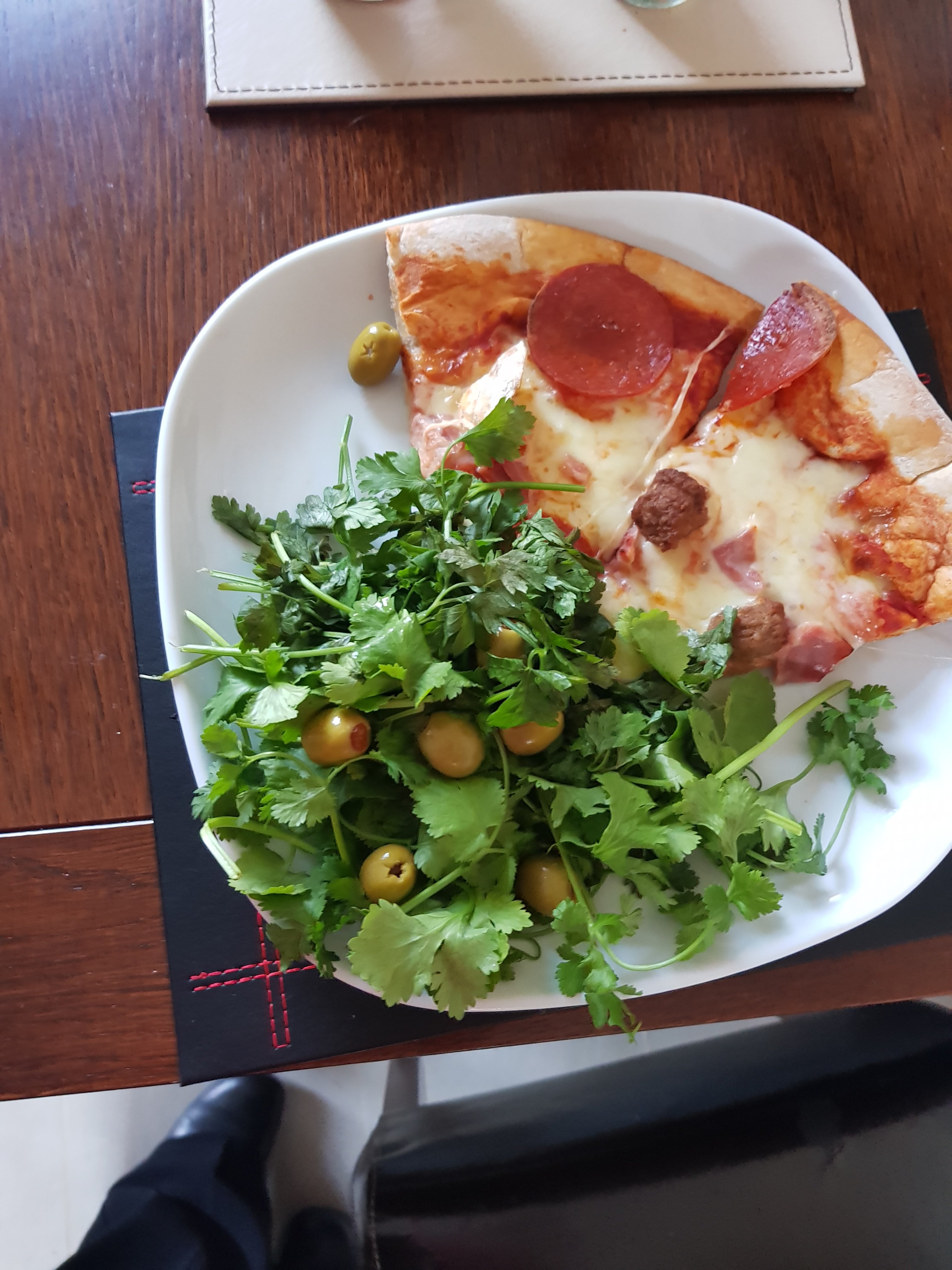 I told him I’m not having half a pizza, he still put a third on my plate! I took off another slice.