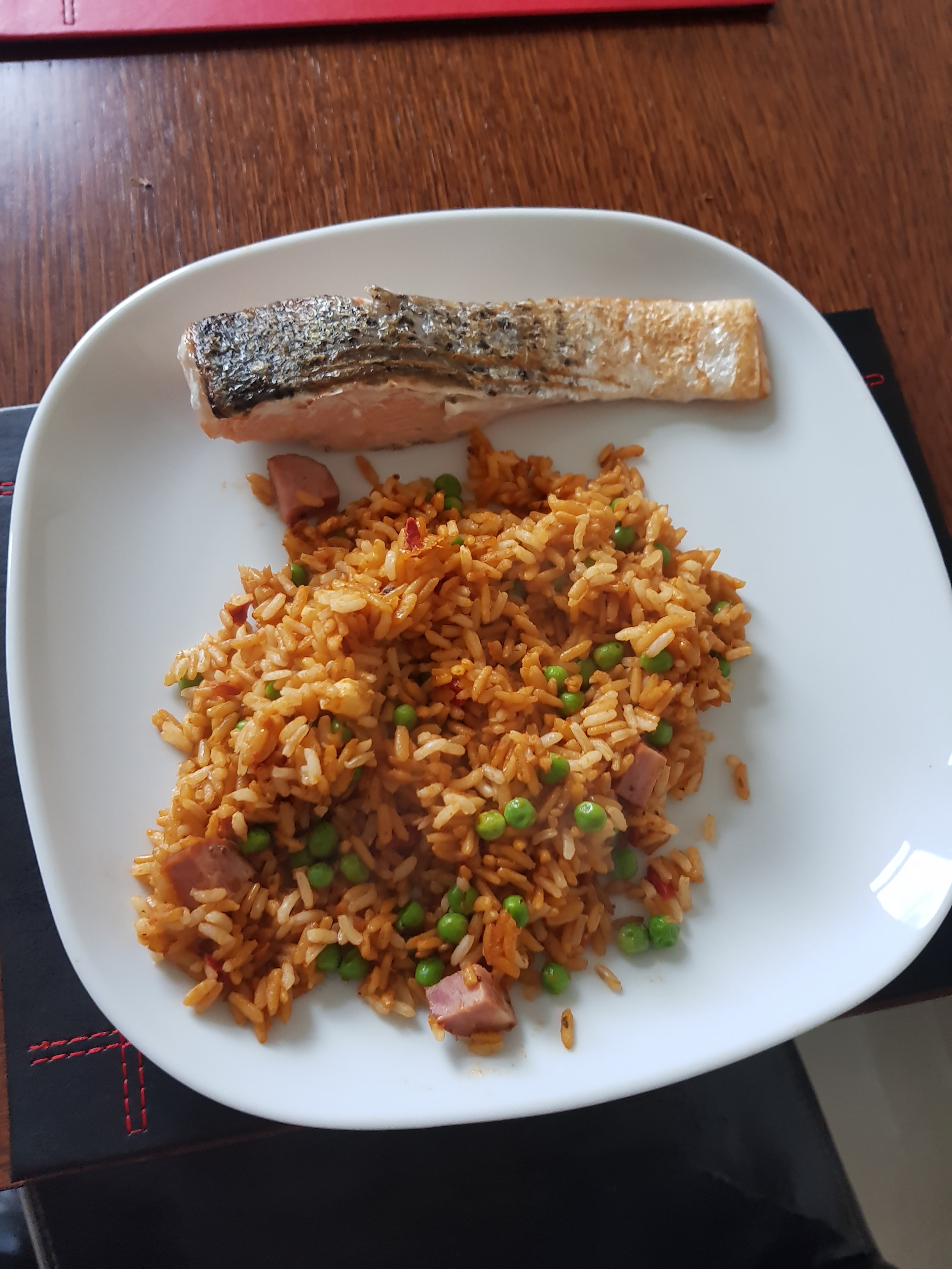I had my nuts, and about two handfuls of grapes, left over pasta from yesterday (which may have had half a portion of veg, but I doubt it), and as I was hungry and quite food needy, a pack of oven baked crisps. This evening, after shopping we had rice mix of a quick cook packet and left over from yesterday) and salmon.