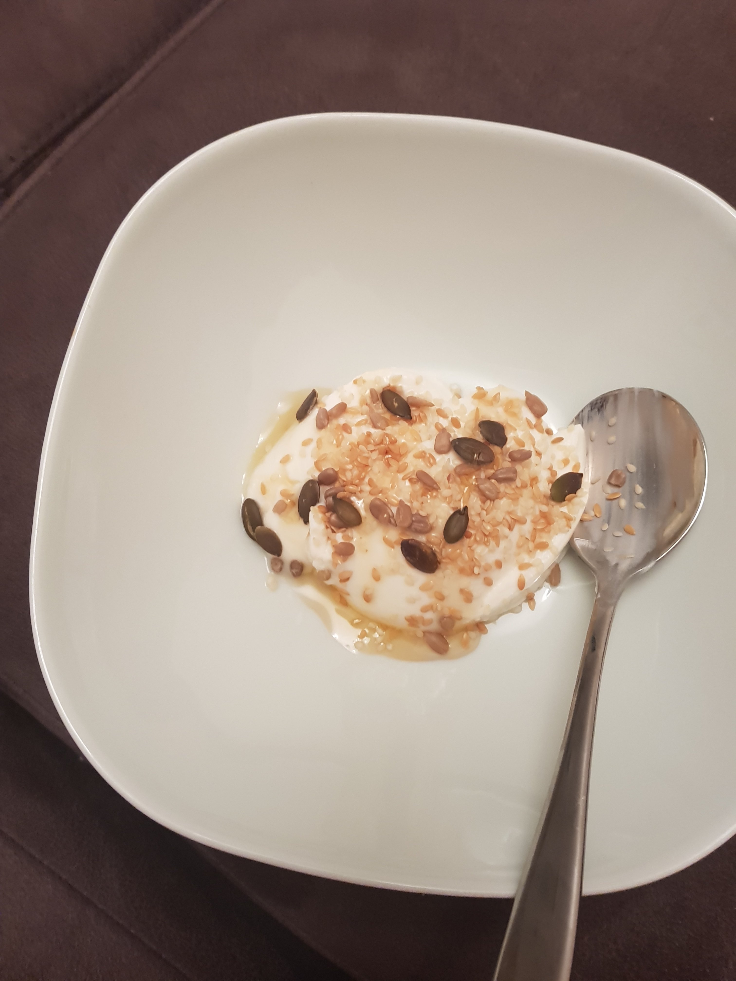 I’m about to tuck into Greek yoghurt with seeds and honey…. YUM!