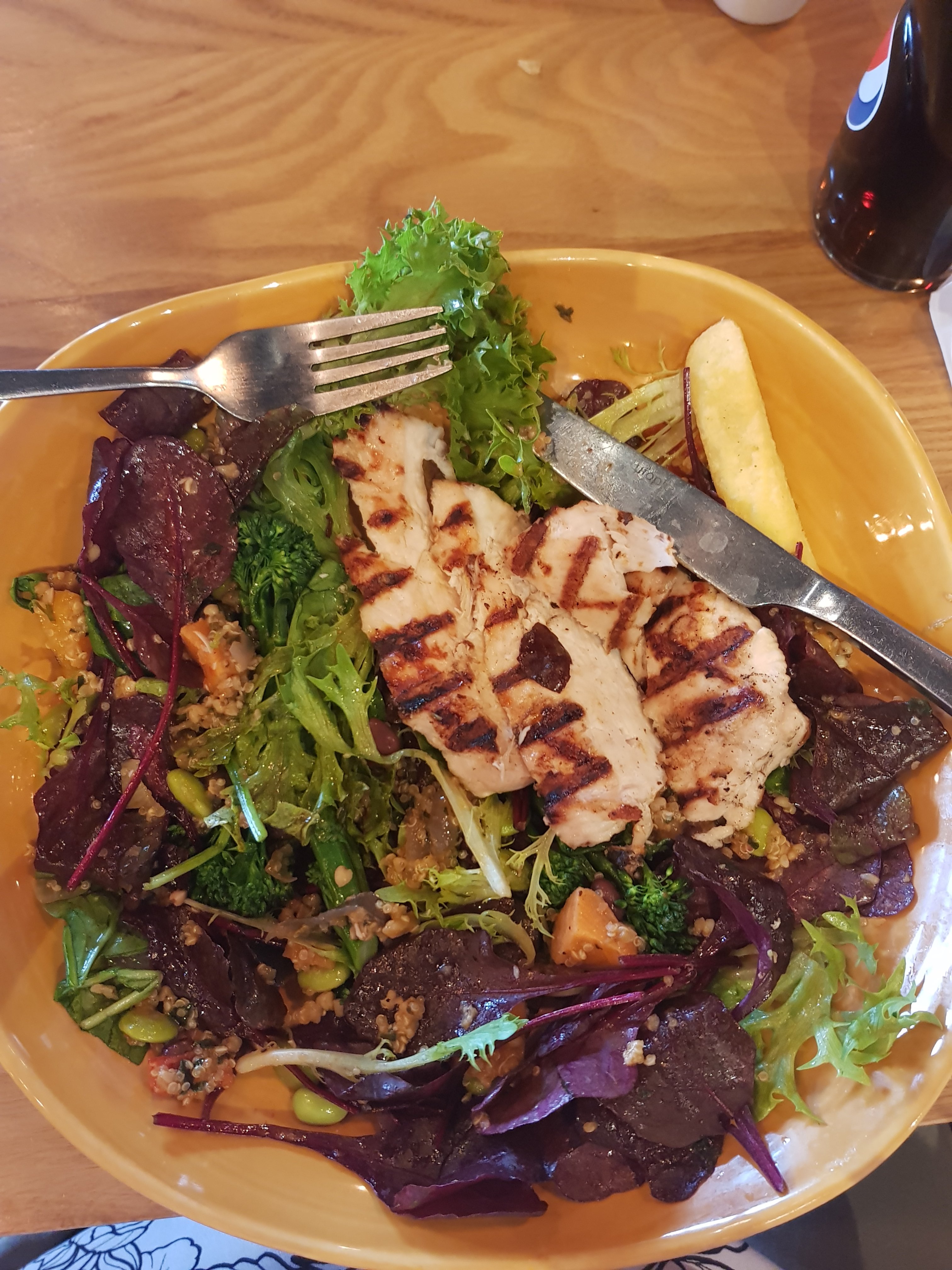 Lunch, salad bowl (pineapple, olives, raisins, couscous, pasta) chicken salad, (menu states salad is 400 calories) plus 1 chip and Pepsi max. I really enjoyed my salad. There was not a single ounce of remorse as my family tucked into their meals and I crunched down on salad 😊