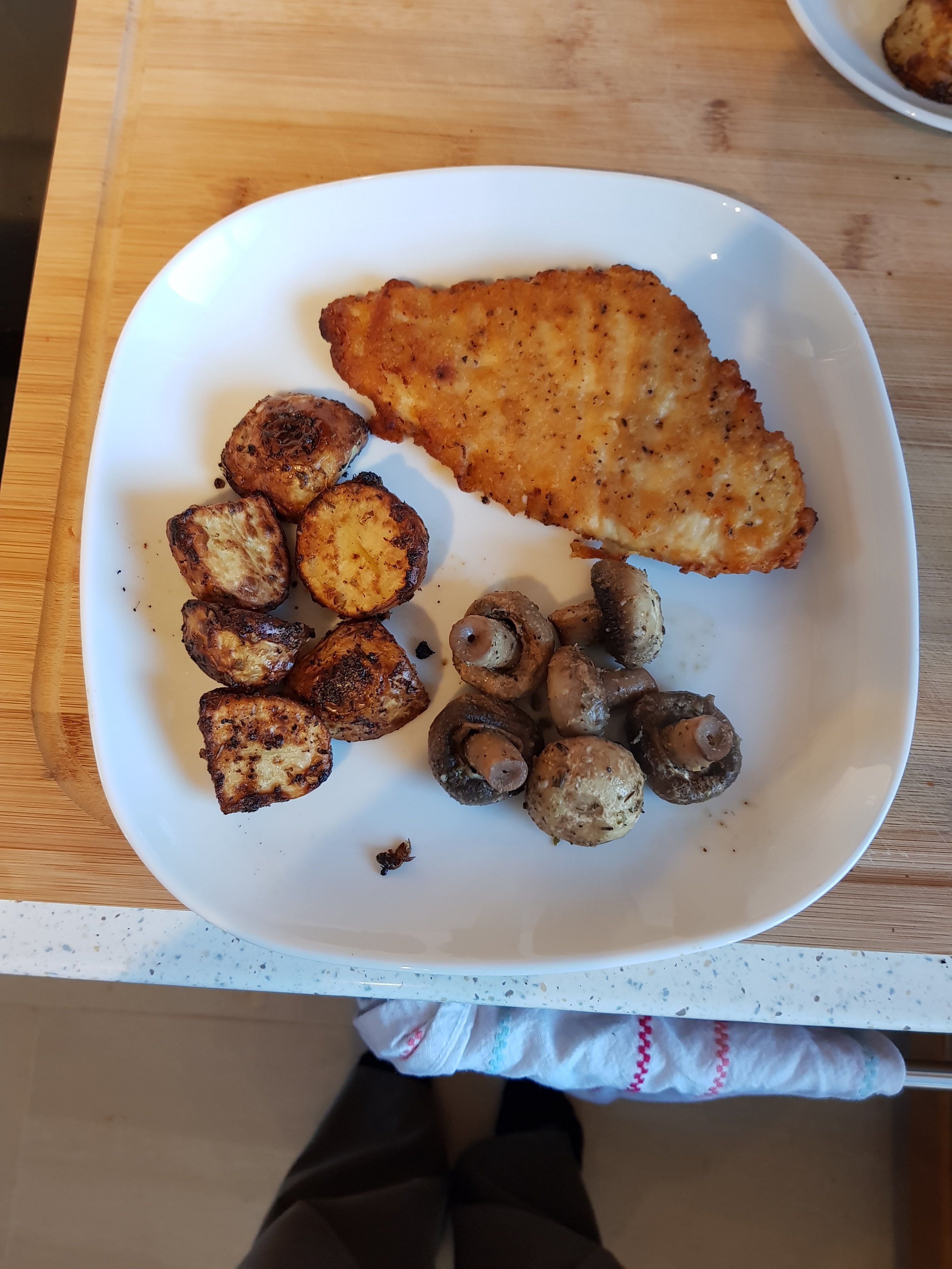 Then dinner, healthier fish, healthy oven spuds and mushrooms cooked with a knob of butter, garlic puree (I love garlic 😂) and dried herbs.