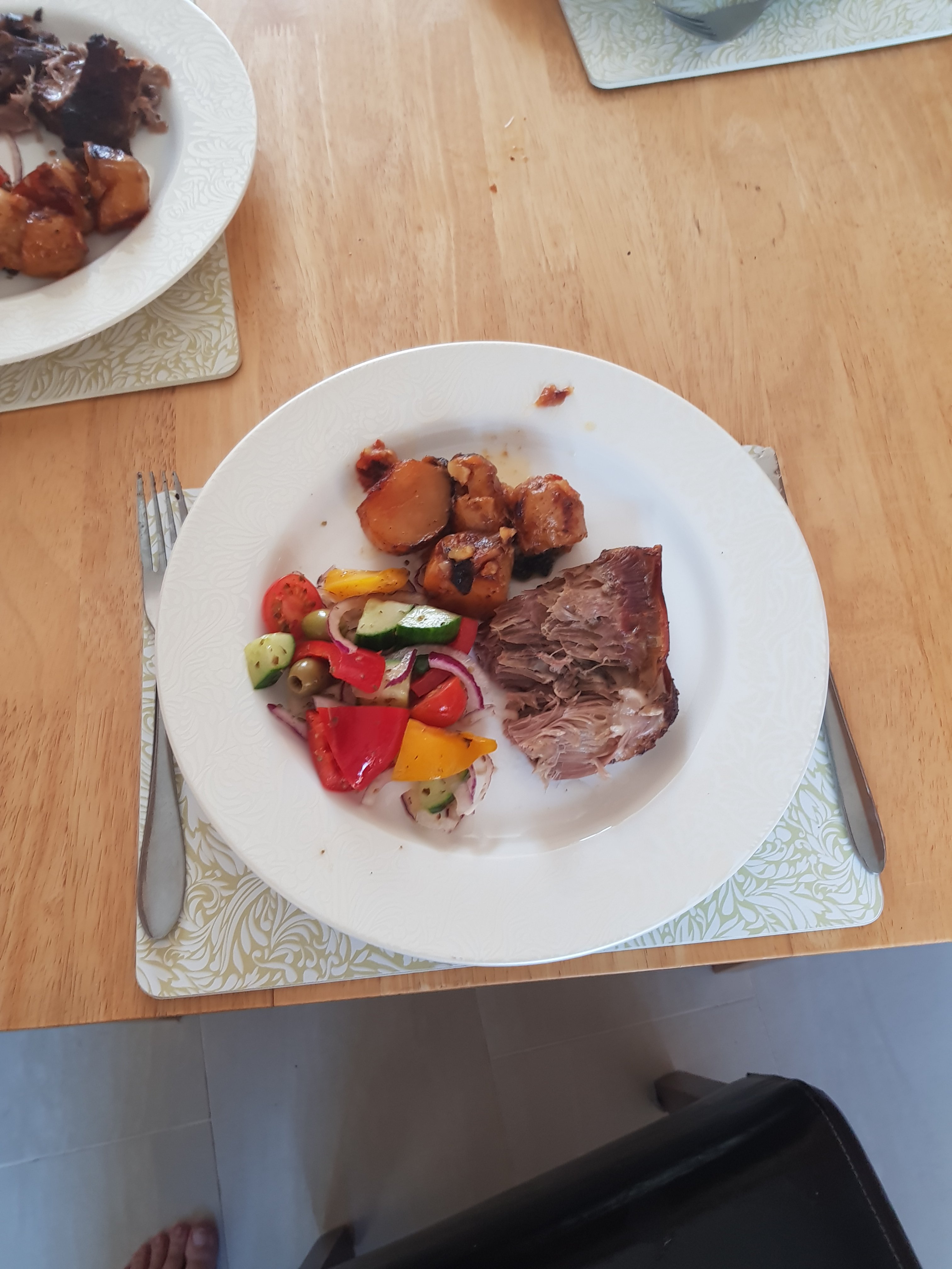 Anyway, we started with a bit of olive oil, balsamic vinegar and slice or two of olive bread, moved on to kleftiko with Greek salad, and finished with fruit and fat free vanilla yoghurt. There was a glass of wine and a glass of full fat coke.