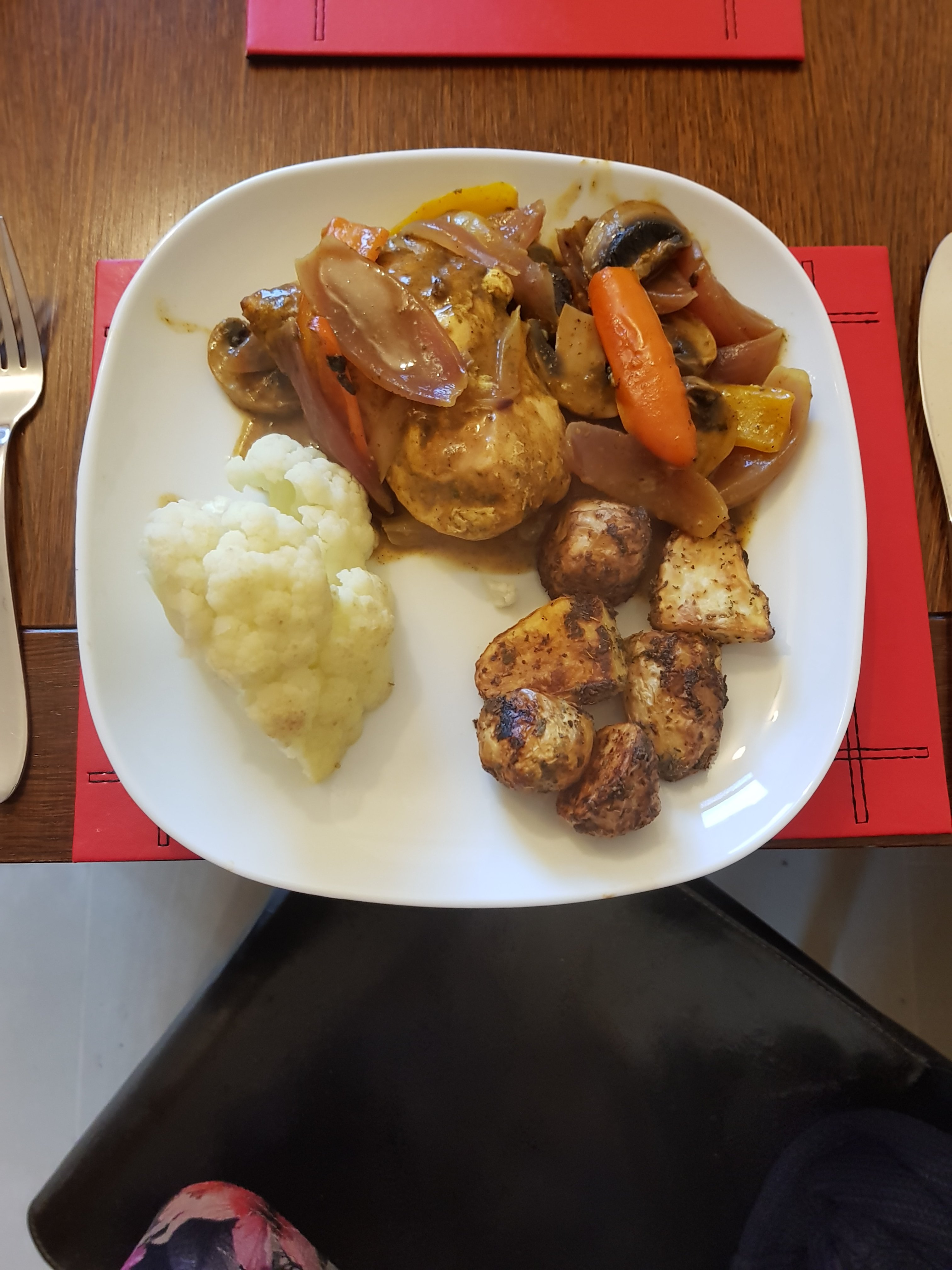 Dinner was chicken cooked on a maggie bag with mushrooms, peppers and onion, with my oven spuds and steamed cauliflower. I was using up remains of veg, so there was too much food, neither of us finished dinner.