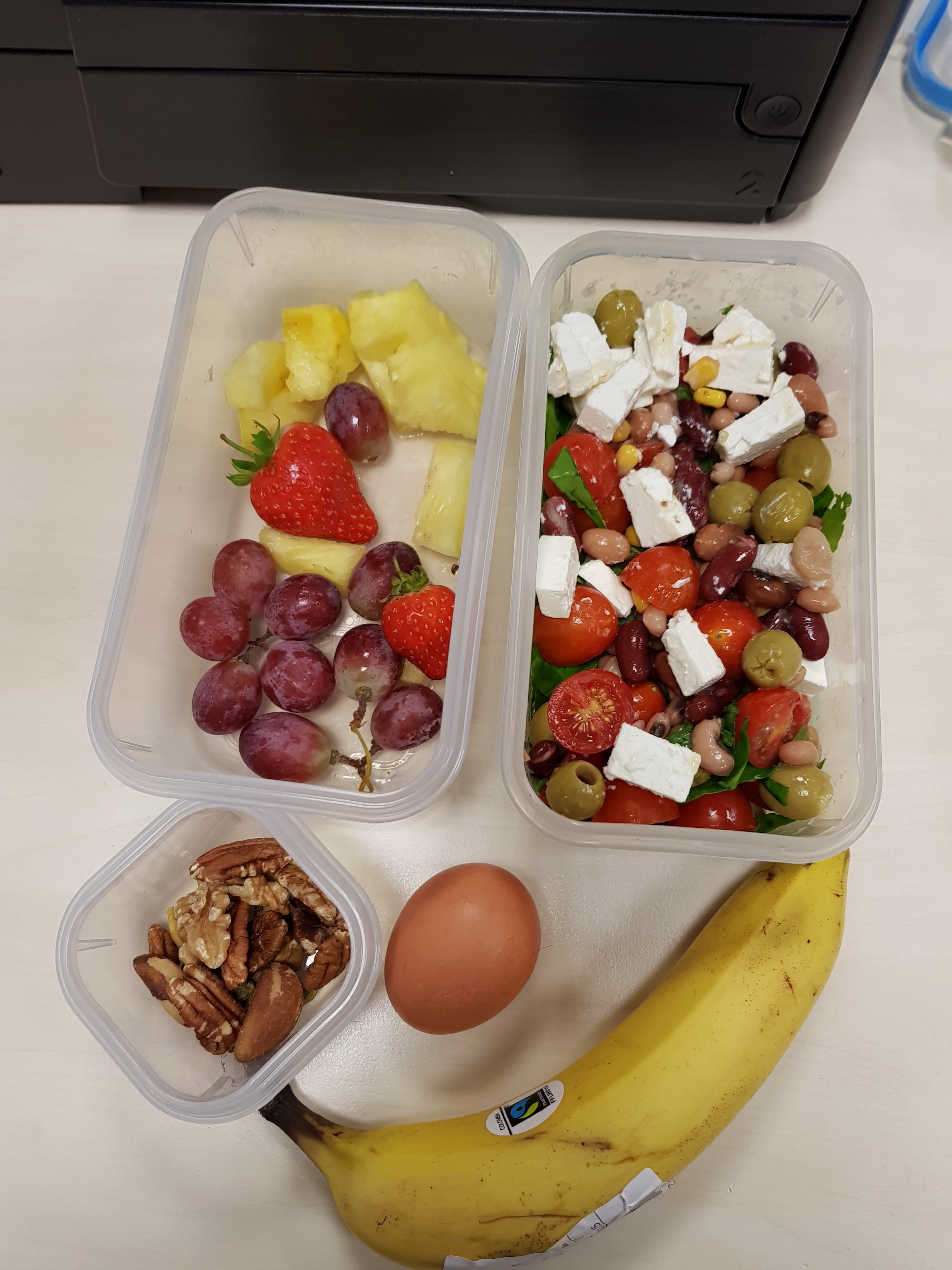 Food – 28g natural nuts, 160g fresh fruit mix, 1 hardboiled egg, salad, 1 banana.