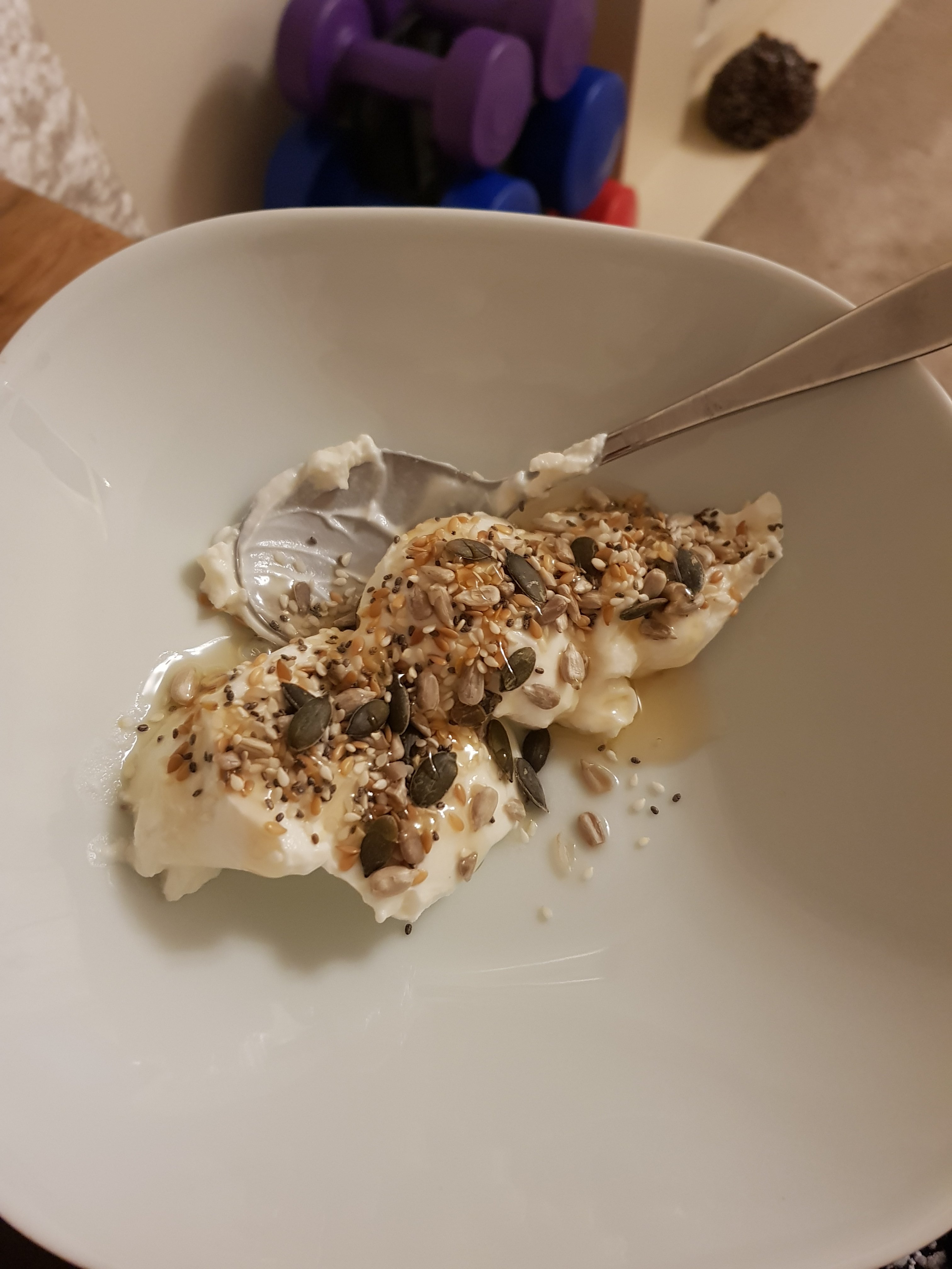 Food – 28g natural nuts, 2 hardboiled eggs, only 1 portion of fruit, salad.