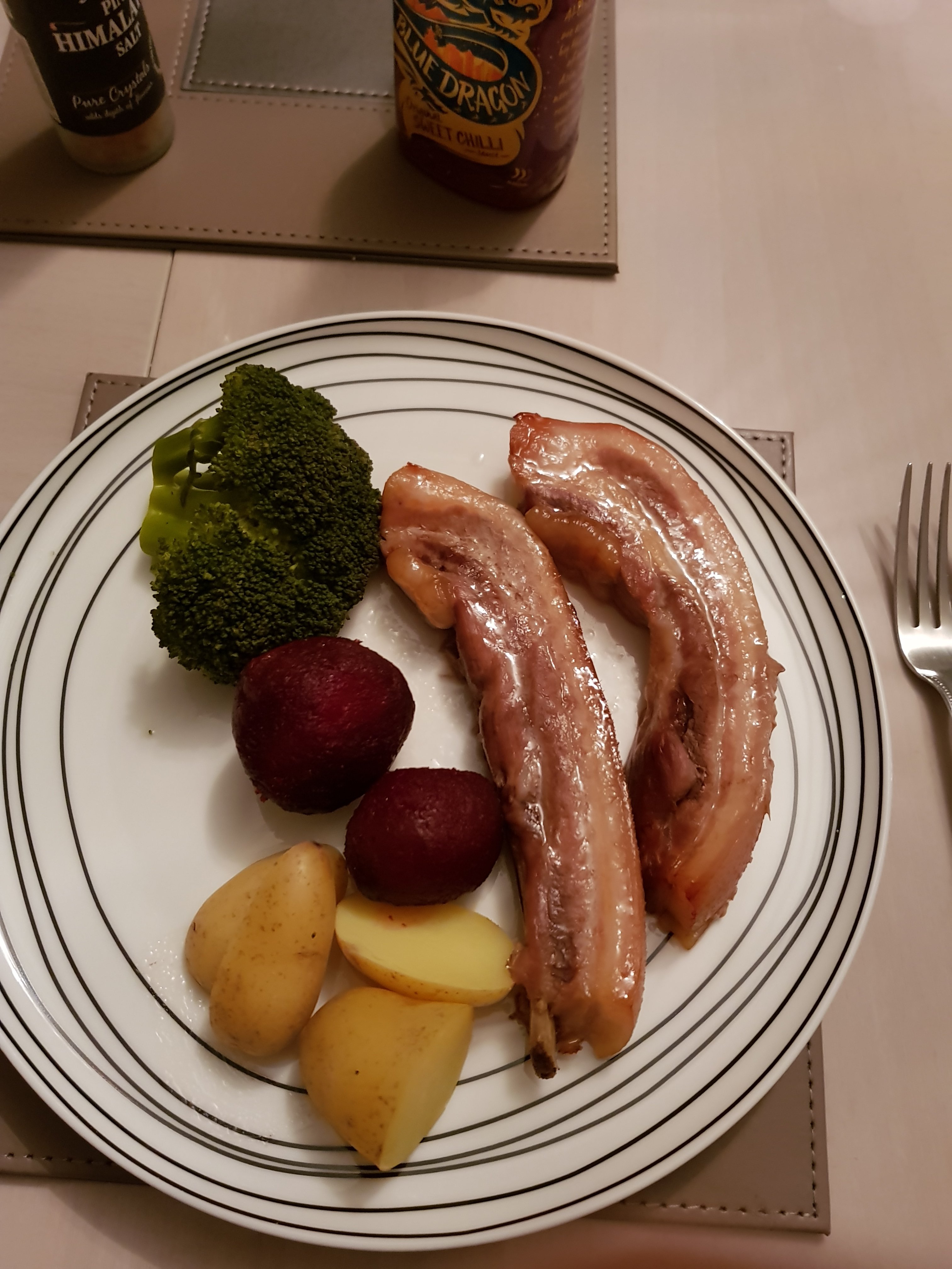 Dinner – belly pork, beetroot, potatoes and broccoli. I cut quite a bit of fat off, though not all.
