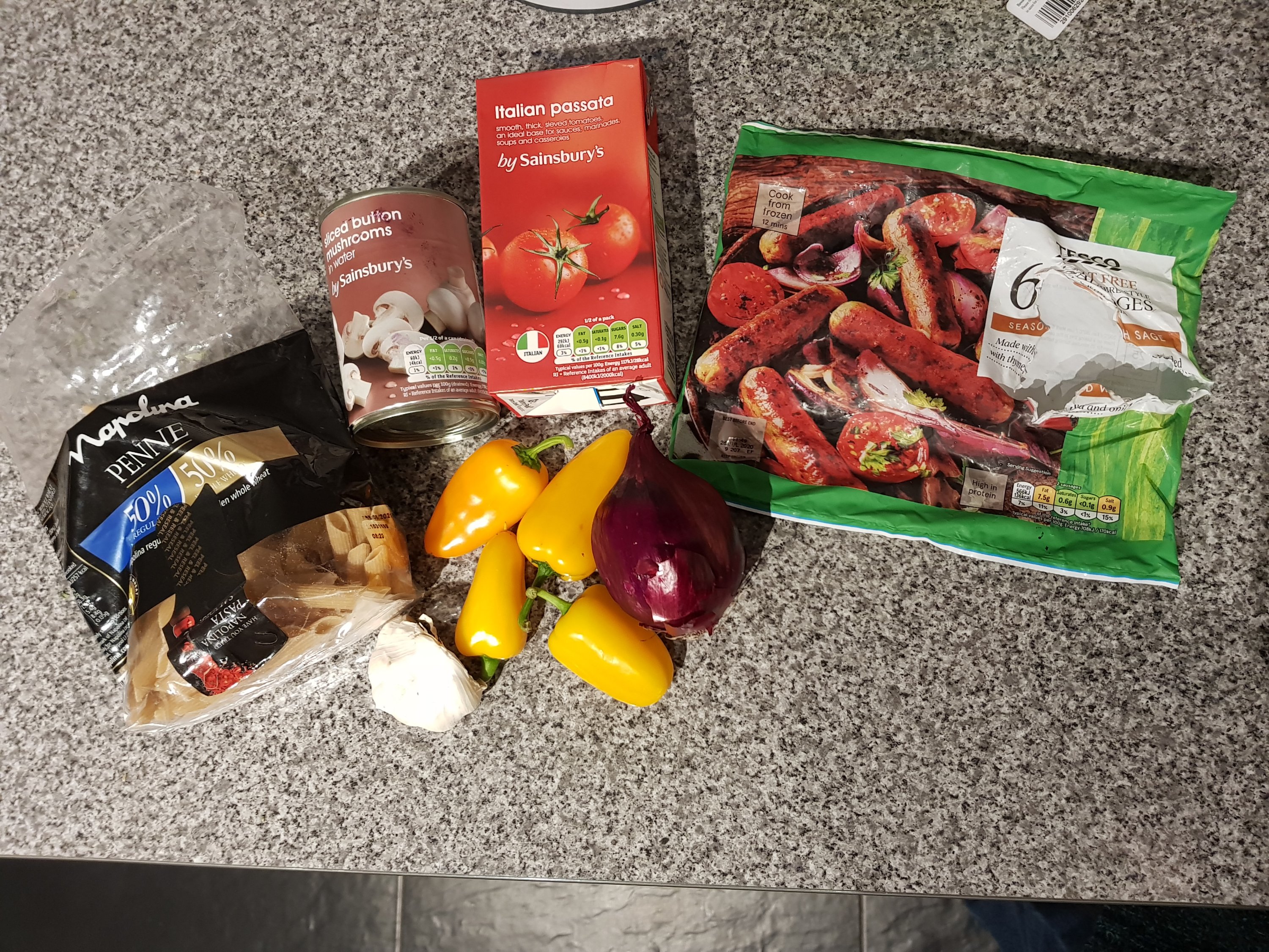I didn’t take a pic of finished plate, but basically a tomato based sausage pasta. I used a bit of mum’s dried herbs and 1cal oil as well.