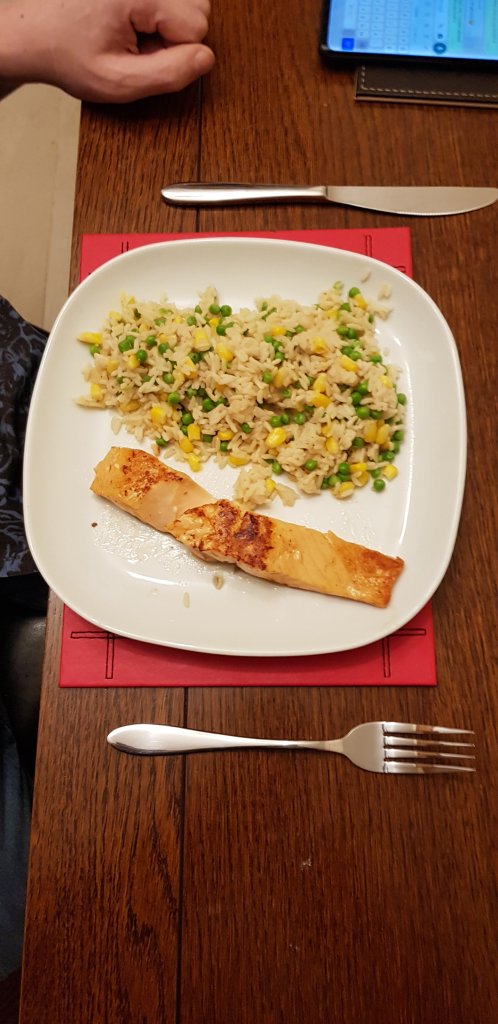 Dinner was smoked salmon with quick cook rice, peas and sweetcorn. I love smoked fish!