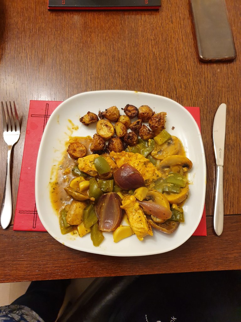 Dinner was chicken in a maggi bag, with a pepper, onion, mushrooms and a load of garlic, and oven cooked spuds.