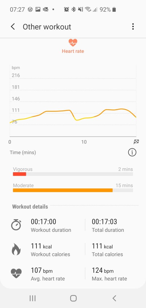 Not much in the way of vigorous exercise, which is good as I don’t want it to be cardio based. A nice few minutes to be added to the weekly moderate activity tally though.