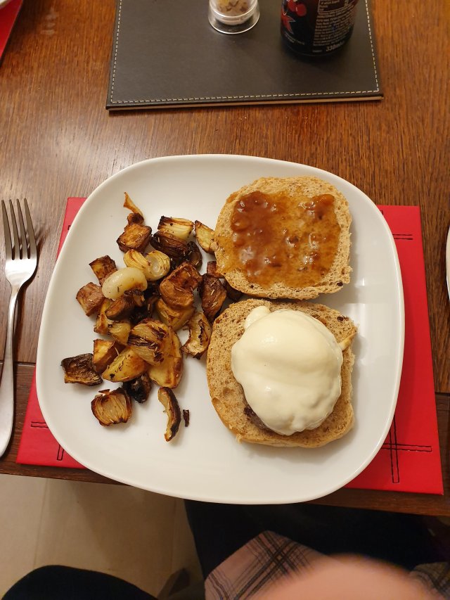 Dinner was pork and venison burger with mozzarella cheese (I thought the cheese was the healthier version but wasn’t) with a bit of sweet chutney in a brown roll, with oven cooked spuds with small sweet onions, smoked garlic, mushrooms, olive oil, garlic puree and dried rosemary.