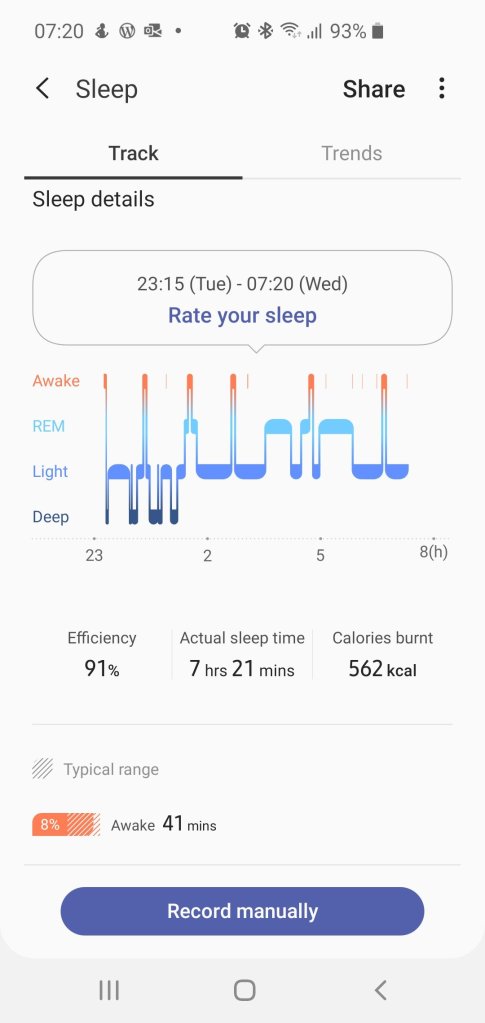 Exercise – now this is really strange. I was slow in my walk, and yet I have several minutes of beyond vigorous activity! I don’t know how, why or even when – buy that, I mean I don’t remember being utterly knackered! But I’ll count it as vigorous anyway!