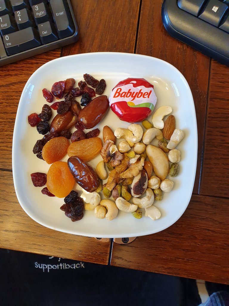 Food – 40g natural nuts, 60g dried fruit, 1 cheese portion.