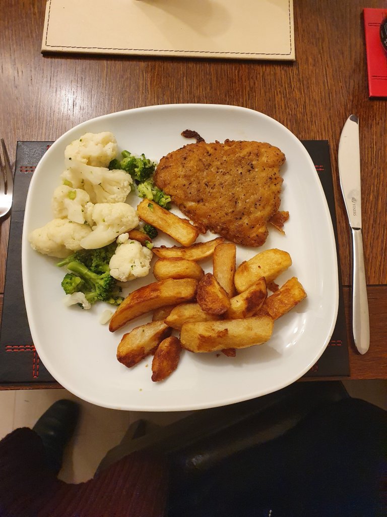 Tonight we had Friday fish and chips with some frozen cauliflower and a tiny bit of broccoli.