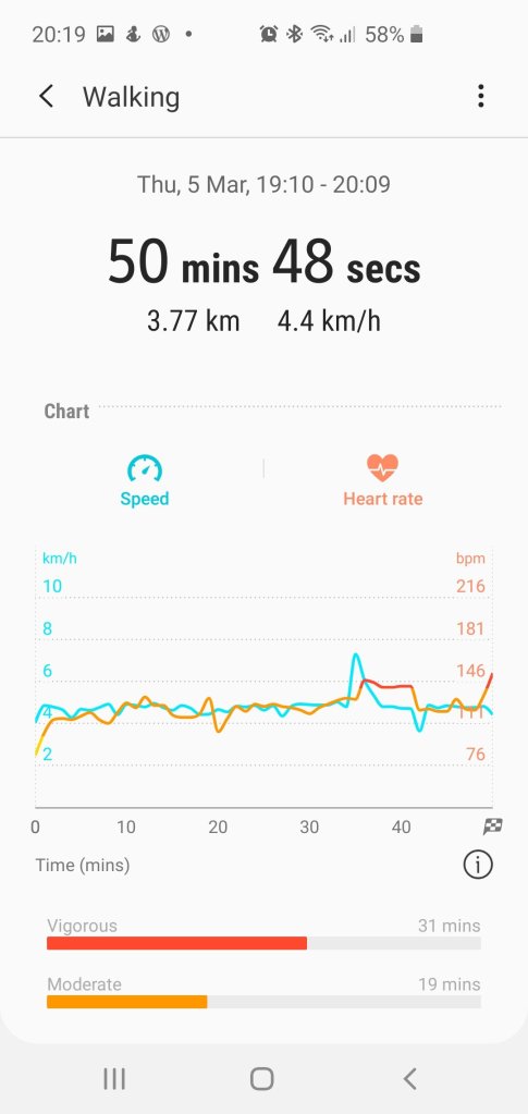 This brings my weekly total to 63 minutes of vigorous activity and 80 minutes of moderate activity. But, despite the walking only one 45 minute walk so far.
