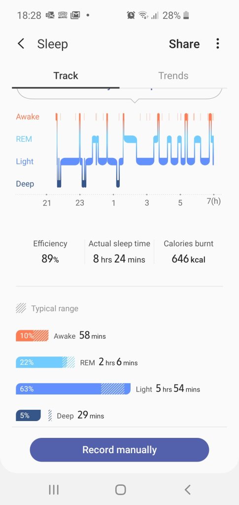 Sleep – courtesy of Paul falling asleep on the sofa, after I wrote my post last night, I suggested we went to bed. So I was in bed by 9.15pm! I had no trouble dropping, shockingly, and felt great when I got up this morning!