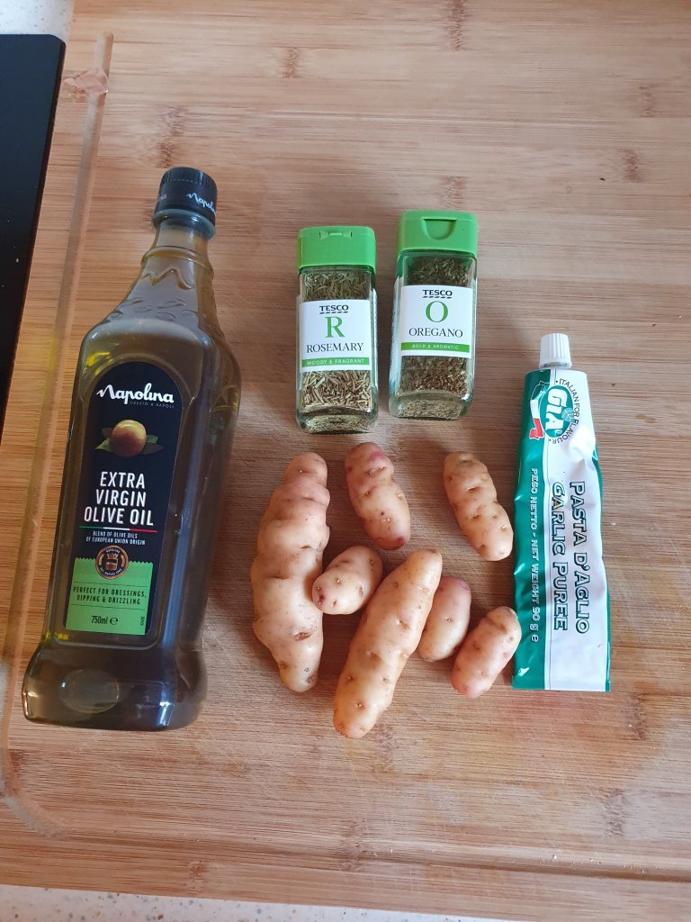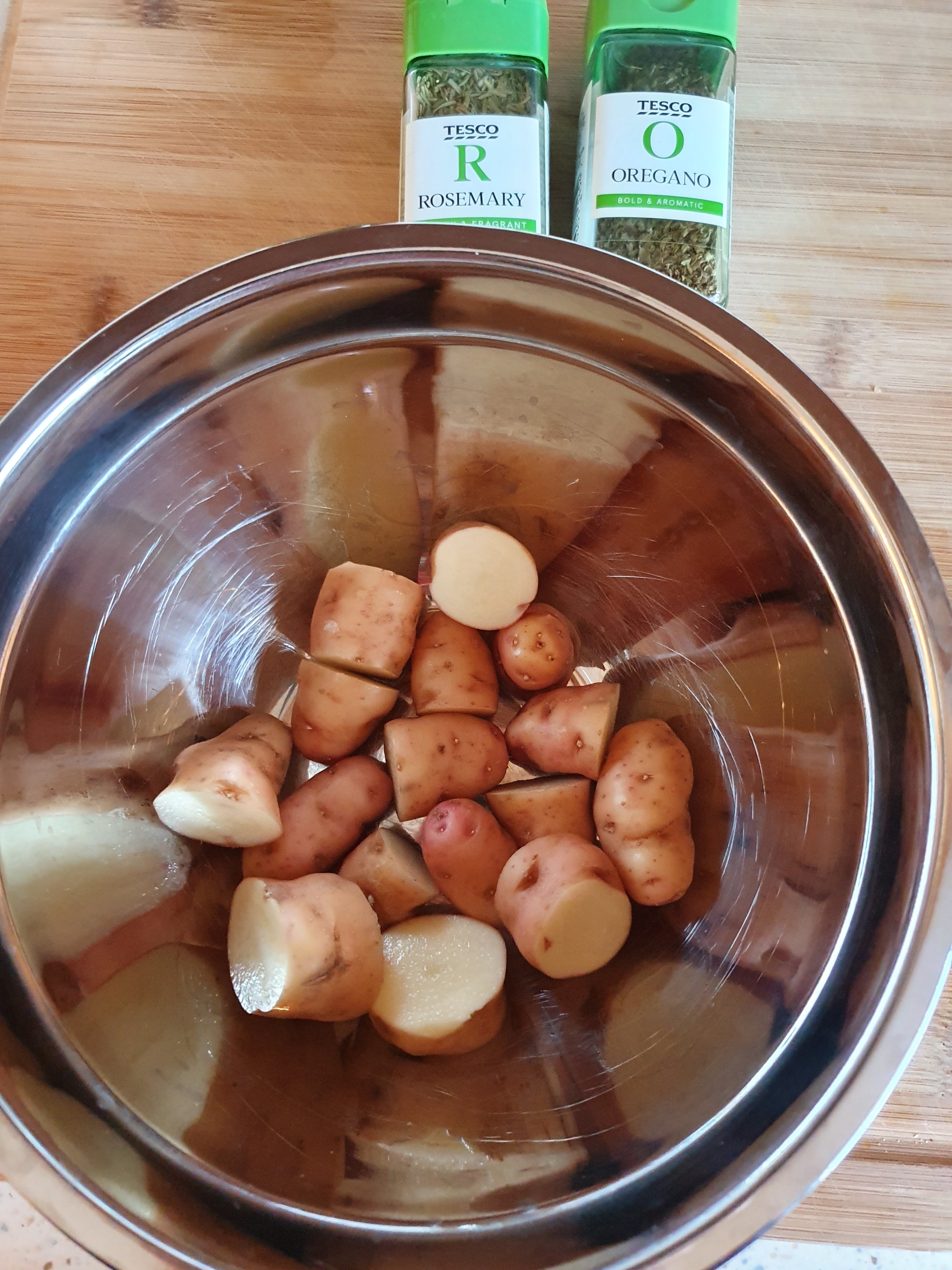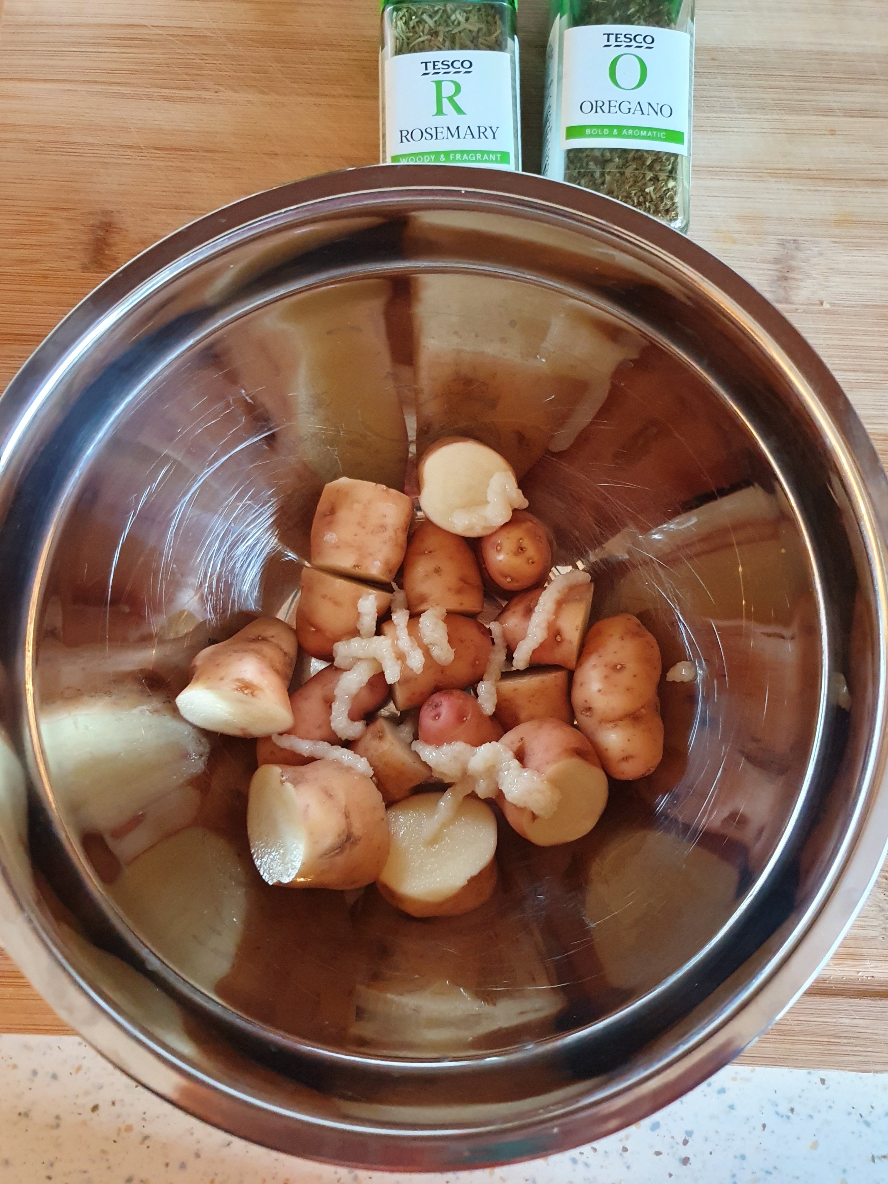 Thought I’d do step by step pics for the spuds, so quick and easy, and about half hour on 160 fan. However, they’ll cook fine at other temperatures, so don’t worry if you need hotter or cooler oven, adjust cook times and test by stabbing!⁶