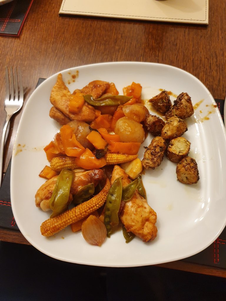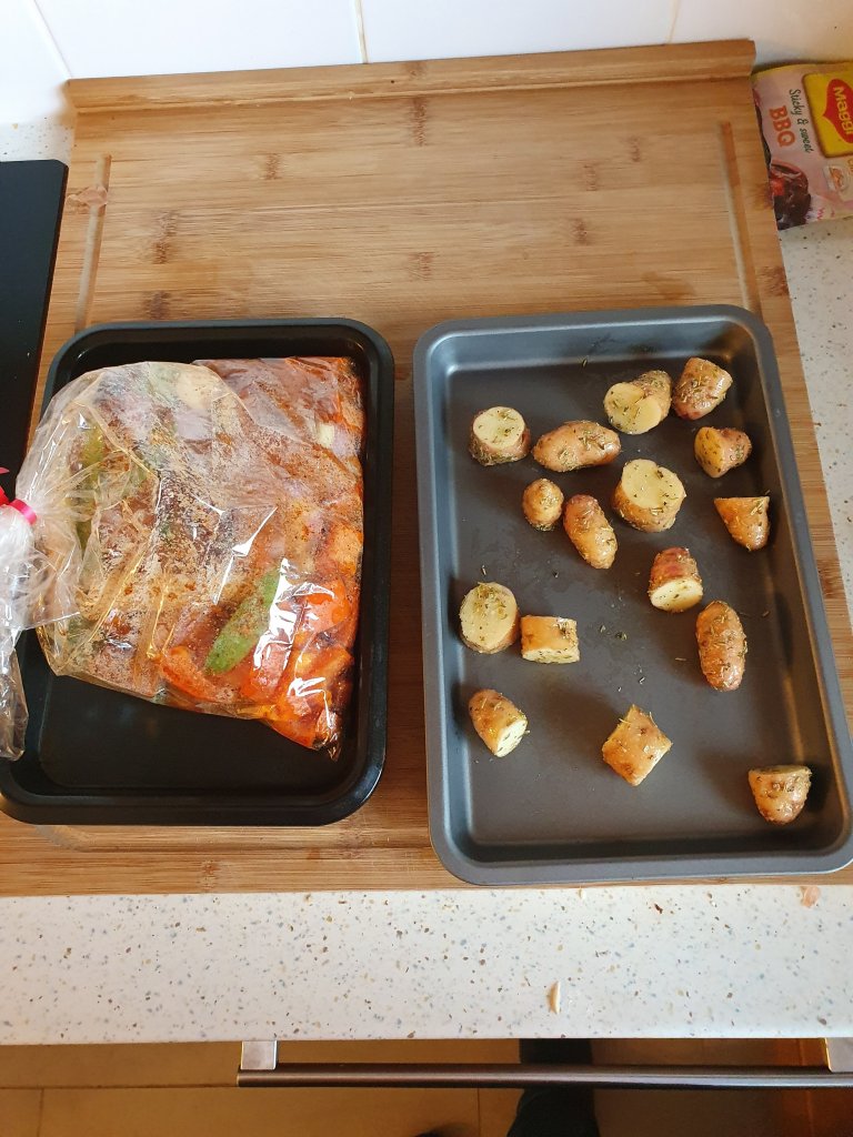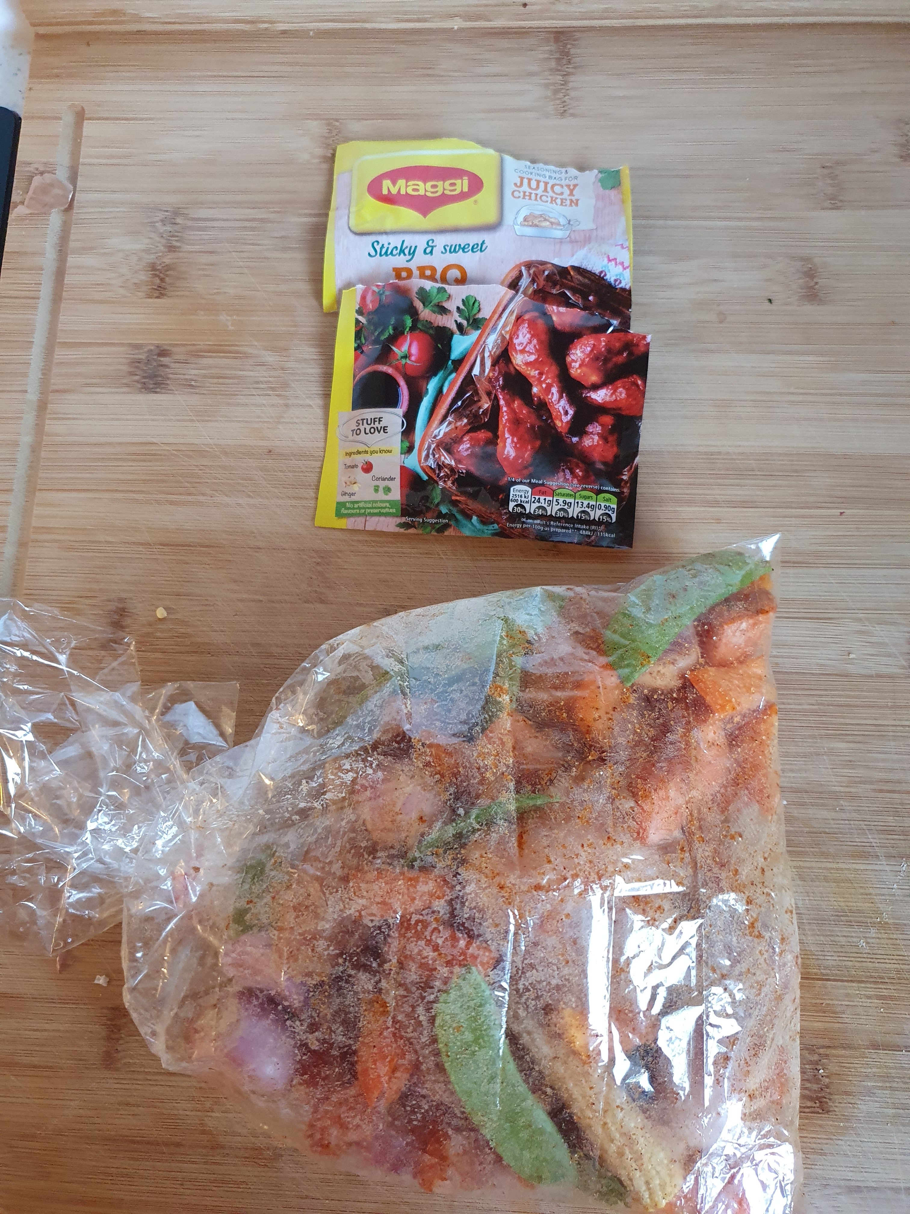 For dinner we had a bbq maggi bag with shallots, garlic, mangetout, sweetcorn and peppers with chicken, and oven cooked spuds. About 10 mins prep, whatever veggies you have spare. Bag instructions – 160 fan, 55 mins.