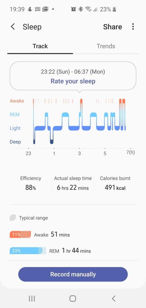 Sleep – I feel knackered despite not many loo stops. But then, i did have less than 6.5 hours.