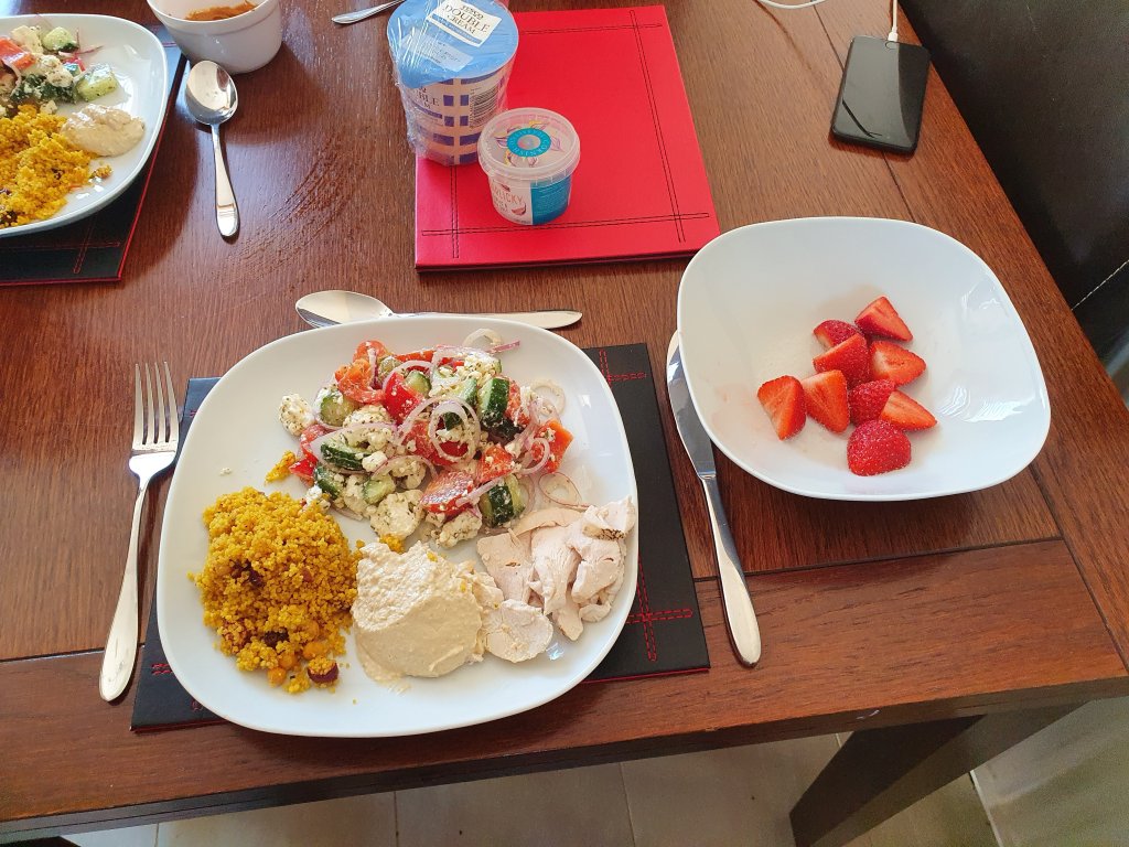 We both enjoyed lunch so much yesterday, we repeated it today. Greek salad, bit of chicken, hummus, couscous, followed by strawberries with a tiny bit of sugar.