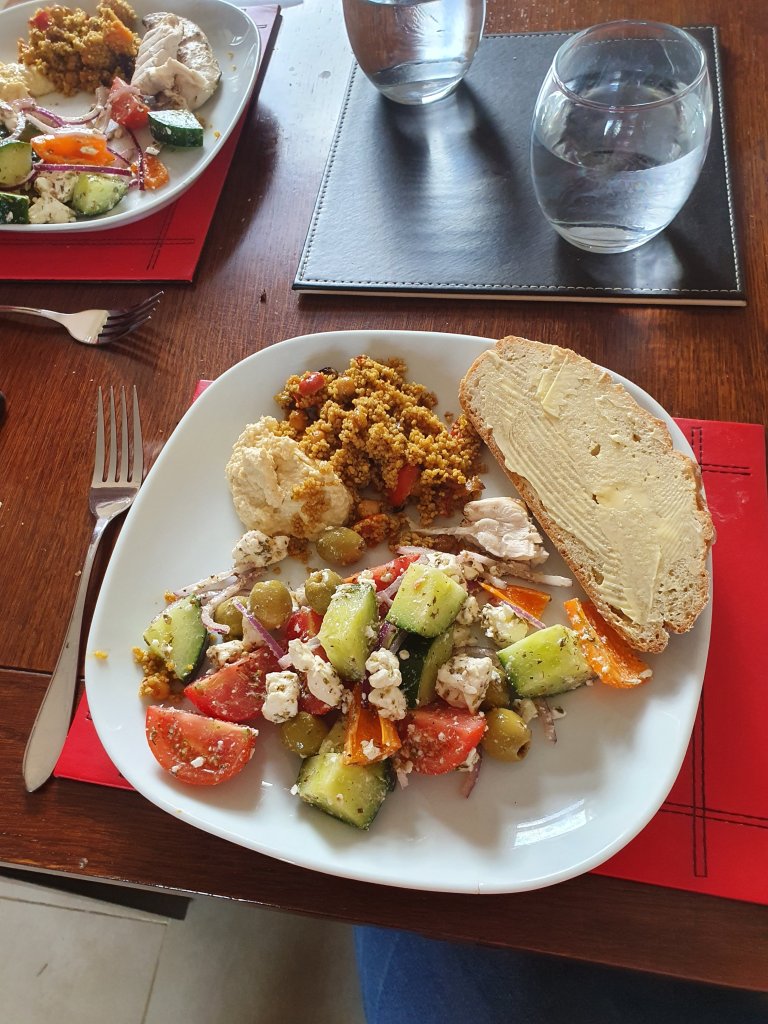 For lunch our usual greek salad, hummus, couscous, Maltese bread and just a mouthful of chicken.