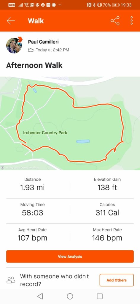 Oddly, my watch didn’t record all our walk, so I’m having to use Paul’s screenshot again! I wonder if my watch just gives up through the woods.