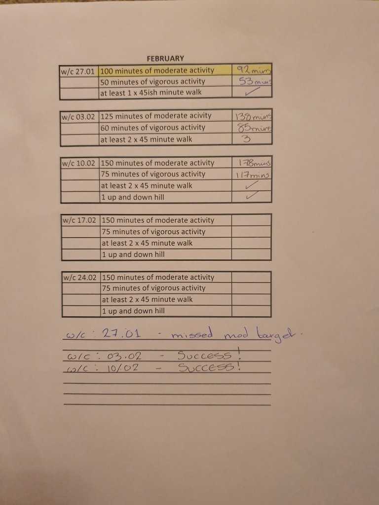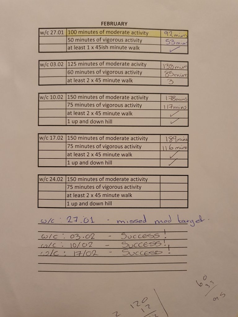 My tracker showed an almost 50/50 split between moderate and vigorous, so taking my time away from Paul’s time, I’ve estimated the additional activity. This means today there was 68 minutes of vigorous activity and 65 minutes of moderate activity.