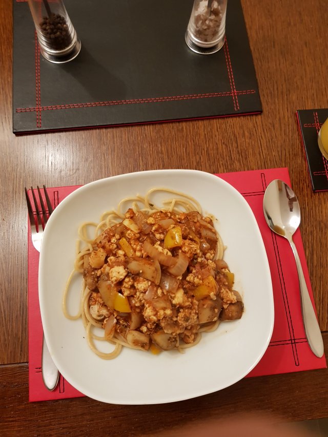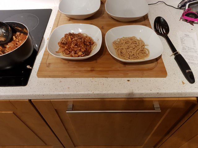 There were only two of us eating today, me and my daughter, so I cooked 100g of spaghetti, but the mince mix is for four. Once cooked I’ll leave half the mix to go cold then freeze it for another day. I don’t own a microwave, so I’ll just leave it in the fridge the night before I want to use it.