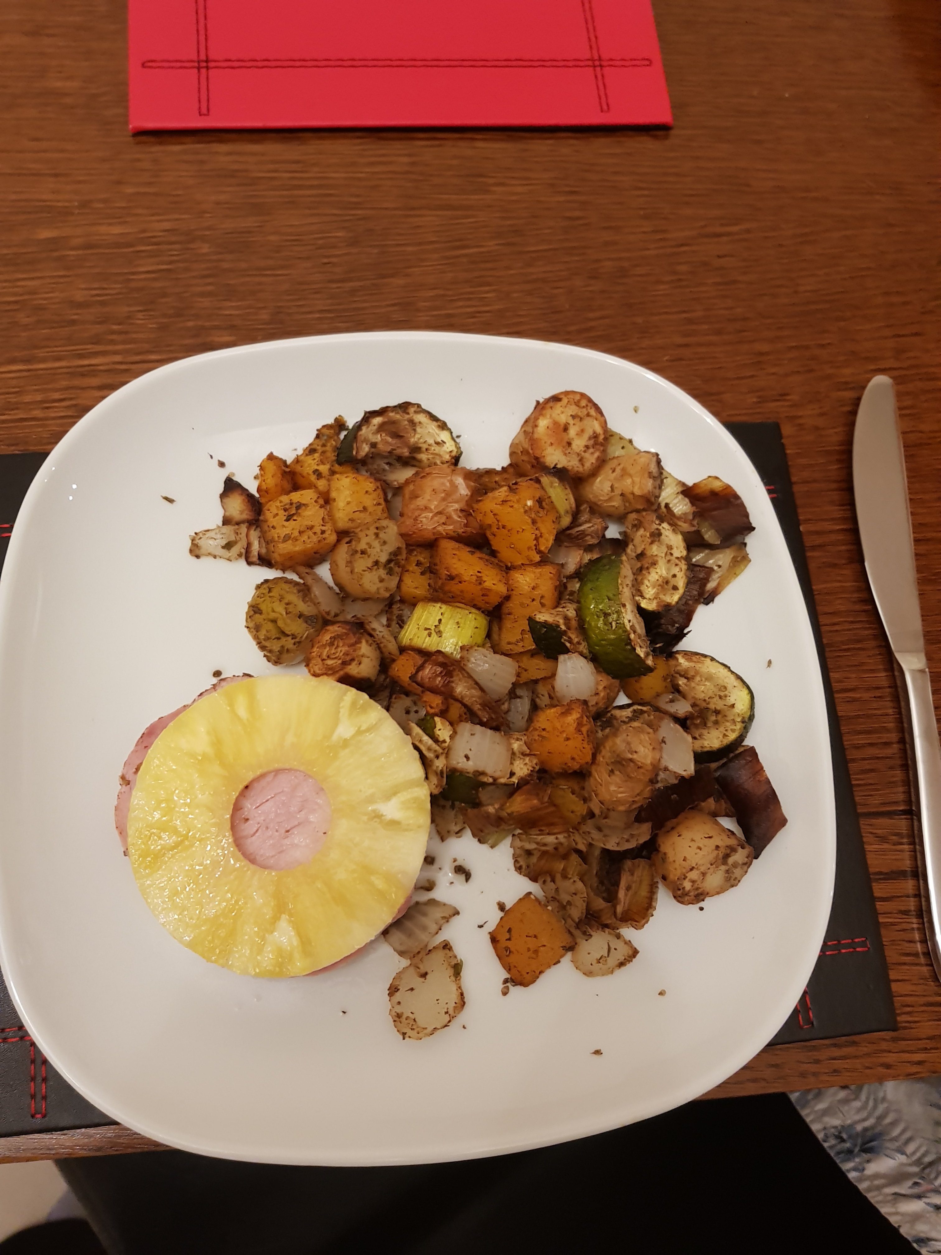 Dinner – belly pork, oven cooked sweet potatoes and steamed beans and tenderstem broccoli.