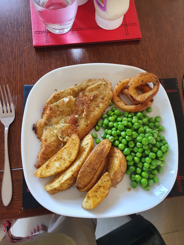 As breakfast was late, we then didn’t eat until dinner. Again, not the healthiest meal, but much more healthier than fish supper from the chippy. Oven cooked chips, peas, onion rings (wanted the nearly empty packet out of the freezer) and lightly dusted sole.
