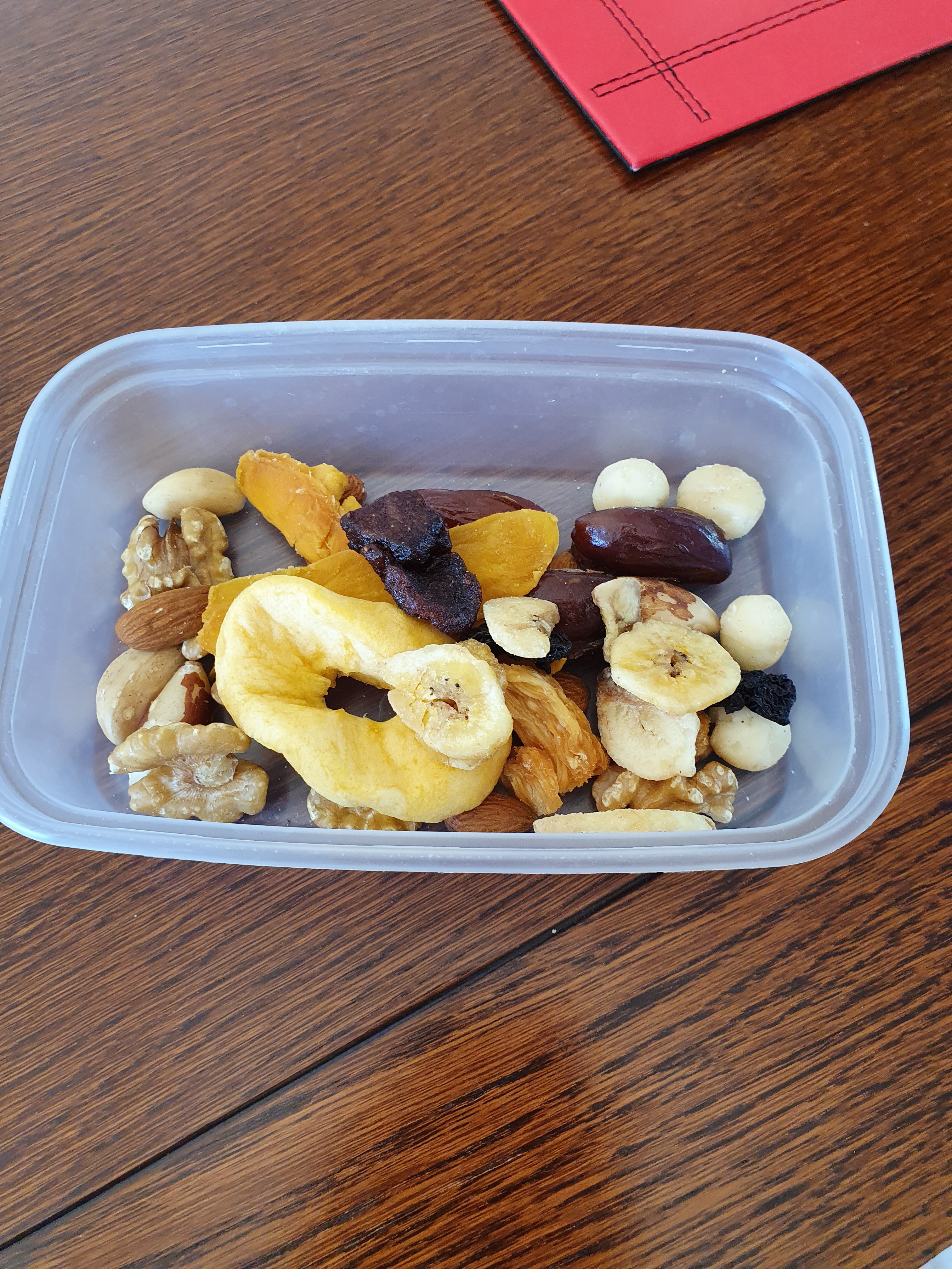 You’ll notice there’s not been much in the way of fruit and veg, mushrooms and pineapple juice this morning and peas this evening. And neither have I had my nuts (as recommended by WHO and NHS), so I’ve weighed off 40g of nuts and 75g of dried fruits each for tonight.